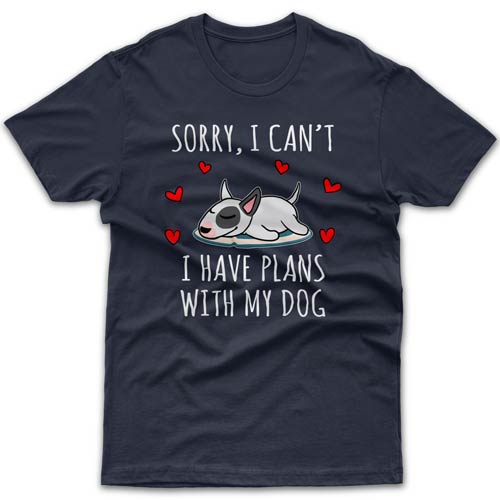 What is a best gift idea for a Bull Terrier owner who seems to have everything? Without a doubt it must be something related to their fur baby - novelty coffee mug, a piece of clothing, tote bag or another dog-related product. Your introverted friend will especially appreciate this cool T-shirt with "Sorry I can't, I have plans with my dog today" message and his/her favourite breed printed on it. Its top-notch quality will satisfy the most demanding customers. Forget about cheaply made Chinese garments with ridiculous delivery times. All orders are dispatched within 1-3 business days from our Melbourne workshop.