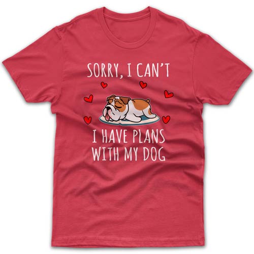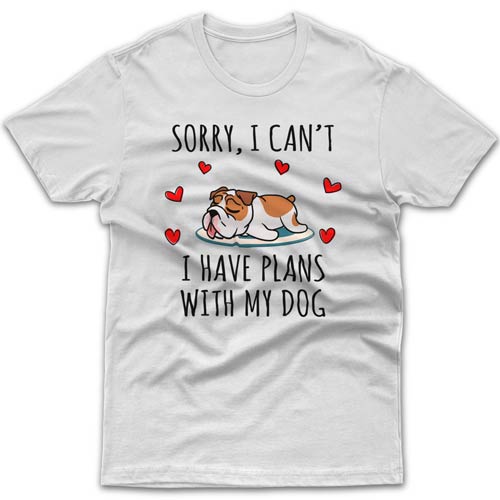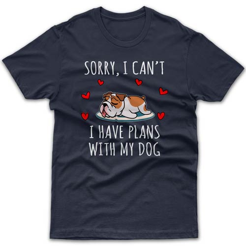 What is a best gift idea for a Bulldog owner who seems to have everything? Without a doubt it must be something related to their fur baby - novelty coffee mug, a piece of clothing, tote bag or another dog-related product. Your introverted friend will especially appreciate this cool T-shirt with "Sorry I can't, I have plans with my dog today" message and his/her favourite breed printed on it. Its top-notch quality will satisfy the most demanding customers. Forget about cheaply made Chinese garments with ridiculous delivery times. All orders are dispatched within 1-3 business days from our Melbourne workshop.