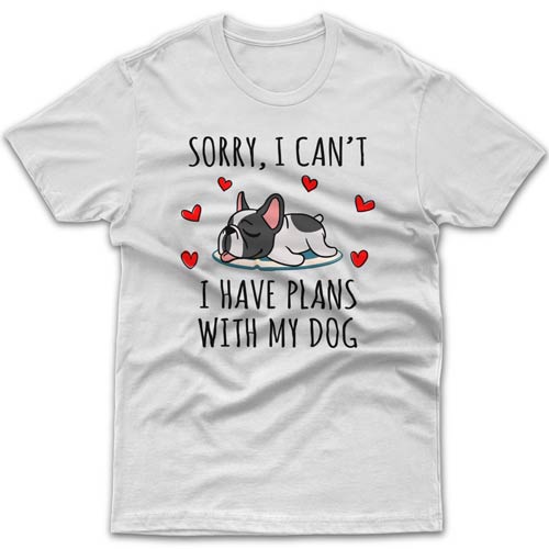 What is a best gift idea for a French Bulldog owner who seems to have everything? Without a doubt it must be something related to their fur baby - novelty coffee mug, a piece of clothing, tote bag or another dog-related product. Your introverted friend will especially appreciate this cool T-shirt with "Sorry I can't, I have plans with my dog today" message and his/her favourite breed printed on it. Its top-notch quality will satisfy the most demanding customers. Forget about cheaply made Chinese garments with ridiculous delivery times. All orders are dispatched within 1-3 business days from our Melbourne workshop.
